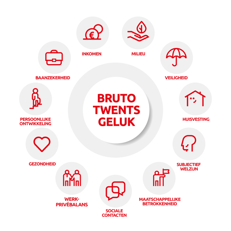Het Bruto Twents Geluk is een regionale vertaling van de elf dimensies van de Brede Welvaart Indicator waarmee landelijk brede welvaart wordt gemeten. Anders dan enkel economische groei en het welbekende bbp wordt hier veel breder gemeten hoe het staat met het welzijn van mensen en hun leefomgeving. Het Bruto Twents Geluk wordt sinds 2024 door de Twenteboard bemeten en bijgehouden, landelijk wordt dit bemeten door Raboresearch. Met Cinergie Twente willen we bijdragen aan brede welvaart in Twente. We werken specifiek aan de volgende dimensies:
