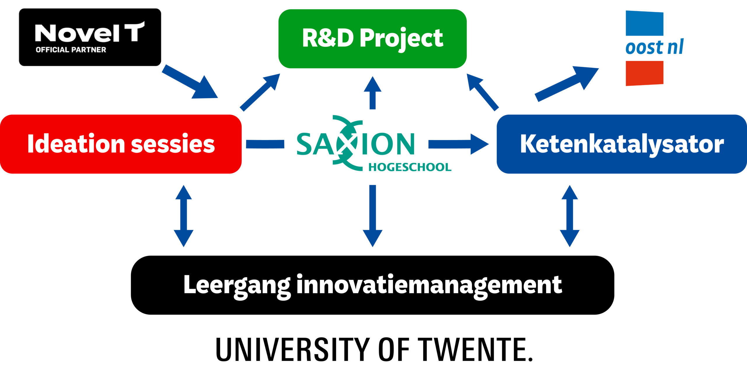 Binnen dit programma werkt Hogeschool Saxion samen met de Universiteit Twente voor de uitvoer van de leergang, NovelT voor het scouten van bedrijven en Oost NL voor het versnellen van innovaties.